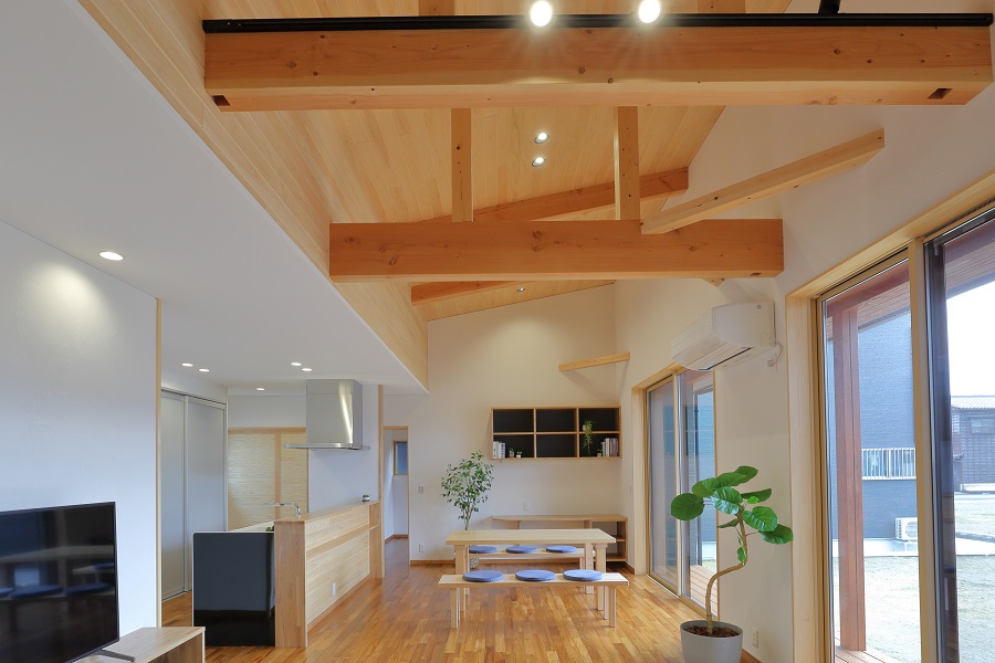 LDKの天井はキッチン部分よりも高く設計し、家族が集まっても窮屈さを感じにくい、のびやかな空間に。