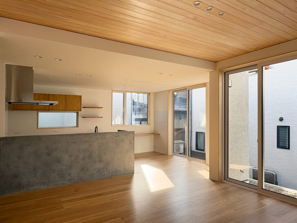 空間に広がりをもたせるために、ハイサッシを採用し、自然光がたっぷりと差し込む、明るく開放的なLDKを実現しました。