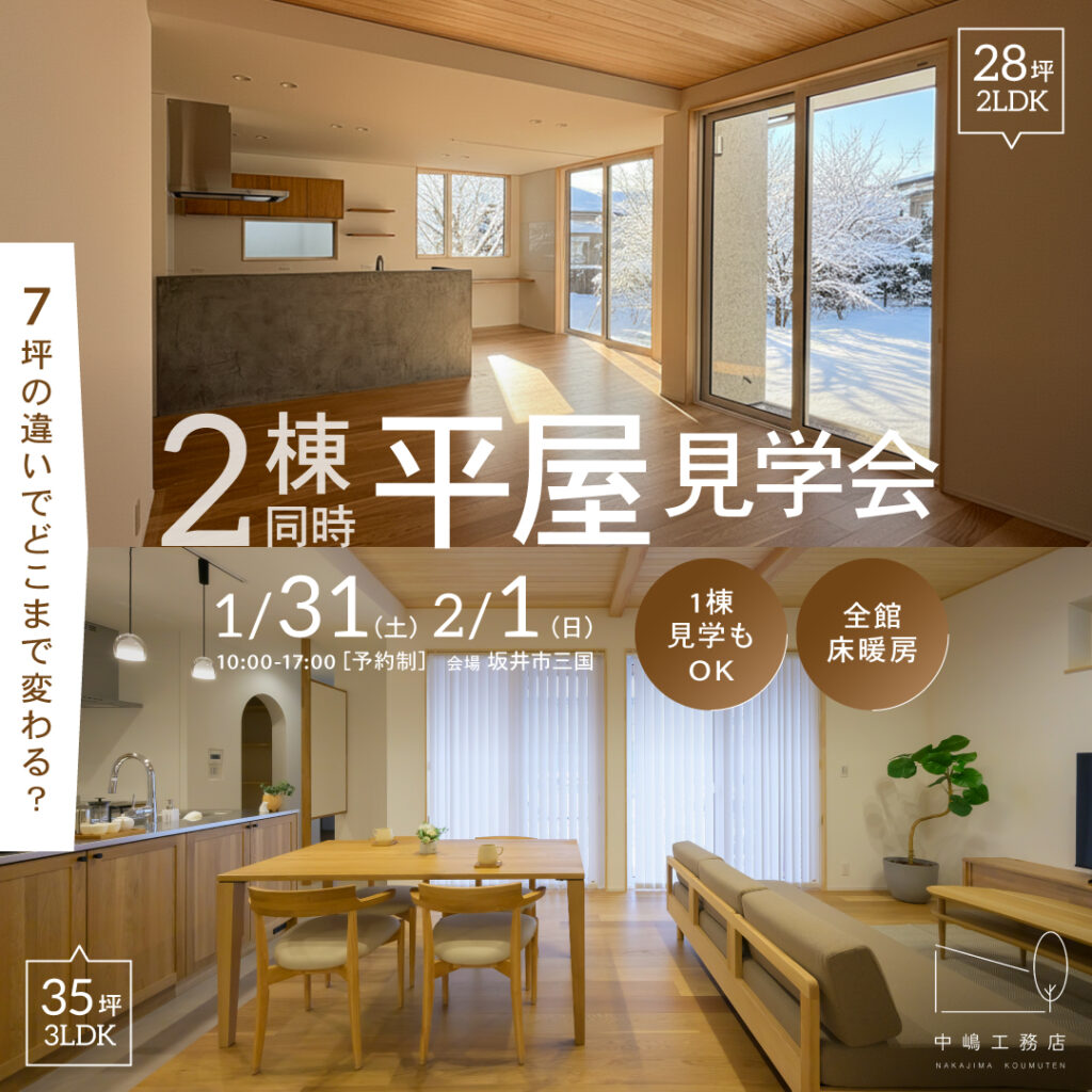 今回の見学会では、7坪の暮らしの違いと併せて、福井の冬の暮らしを根本的に変える全館床暖房による”極暖”を、ぜひ体感してみてください。暖かさがよく分かる今の時期がおすすめです。