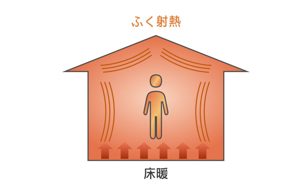 全館床暖房の住まいは、床そのものがやさしく発熱し、家の壁や天井にも暖かさが伝わる「ふく射熱効果」で、家全体を包み込むように暖めます。