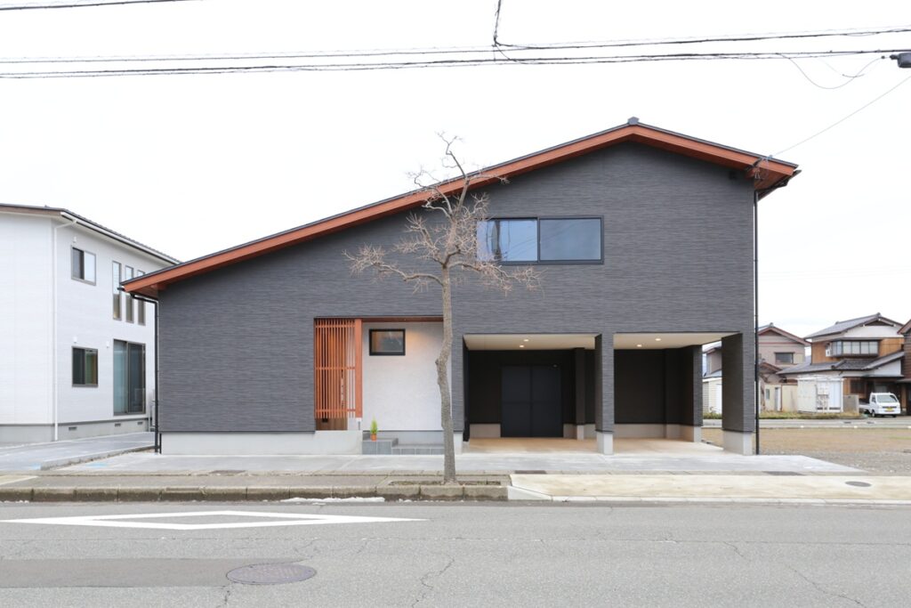 傾斜をつけた屋根にブラックを基調としたそとん壁(シラス台地のシラスを原材料とする自然素材の外壁材)。