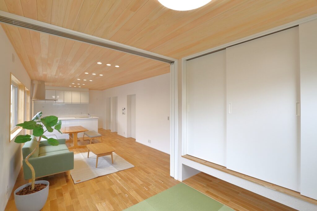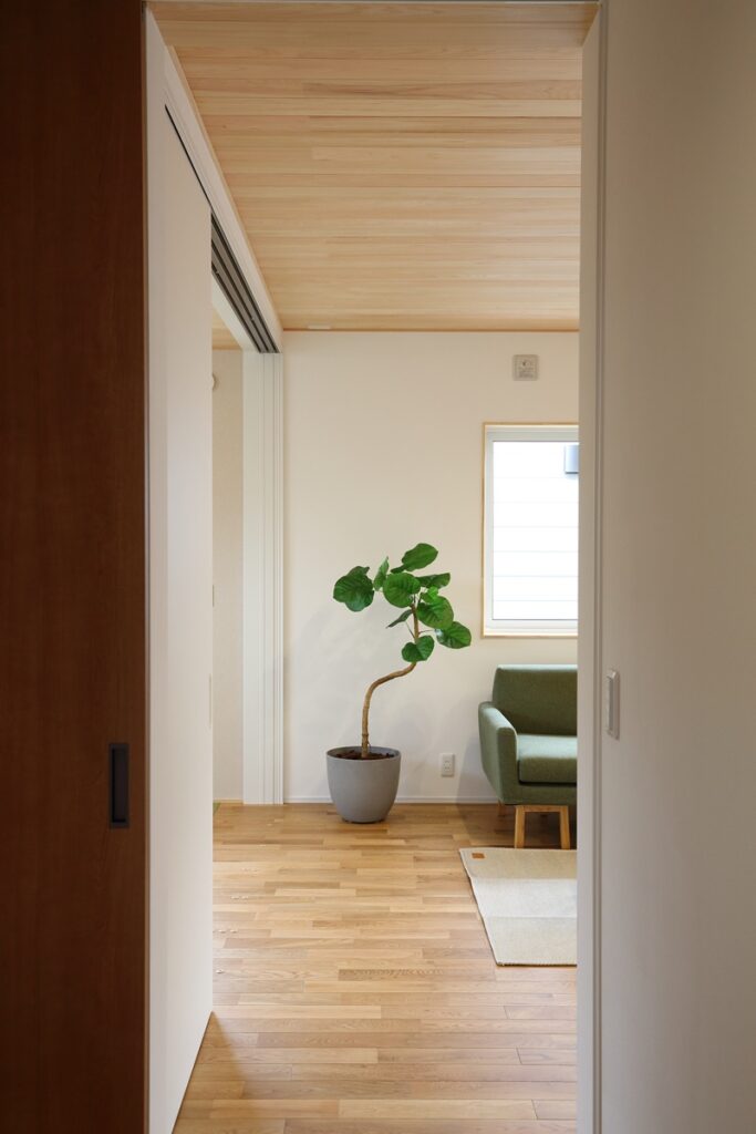 壁は和紙に漆喰を塗ったプラネットウォール。床はナラの無垢フローリング・天井はヒノキの無垢板を使用。