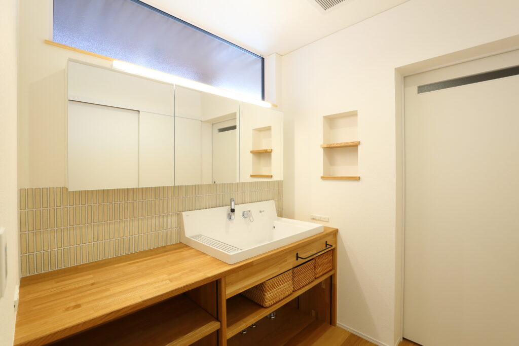 海外製の大容量フロントオープンの食洗器や、造作洗面にハイバック式の洗面器を組み合わせるなど、こだわりながら、家事ラクも実現しています。