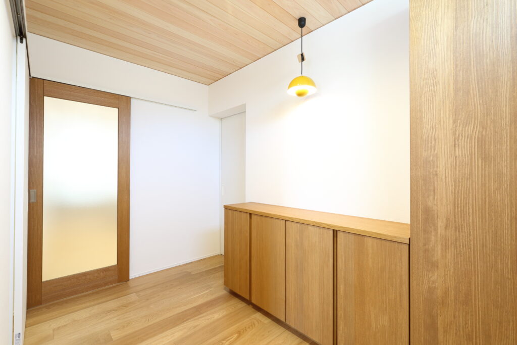 ヒノキの香りがする玄関では、施主様こだわりのペンダントライトが出迎えてくれます。